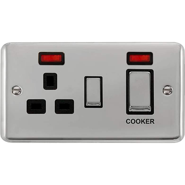 Deco plus rounded profile black insert polished chrome 45A ingot 2 gang double pole switch 13A double pole switched socket outlet & neons. · · · Dimensions 146mm (W) x 88mm (H) x 8mm (D) · · Plate Design & Finish Rounded Profile Polished Chrome · · Insert & Gasket Colour Black · · Front Plate: Stainless Steel · · Maximum Voltage 250V · · Load Rating 45A · · Plate Fixing Centres 120.6mm (Vertical Fixing) · · Terminal Size 6mm · · Terminal Torque 2.5Nm · · Terminal Capacity 1 x 16mm