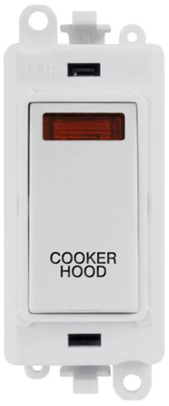 Gridpro cooker hood laser etched legend polar white frame 20AX polar white double pole switch with neon module. · · · Dimensions 24.5mm (W) x 50mm (H) x 22.5mm (D) · · Aperture Dimensions 20mm (W) x 35mm (H) · · Module Frame Finish Polar White · · Switch Finish Polar White · · Laser Etched Legend Cooker Hood · · Body & Insert: Nylon · · Maximum Voltage 250V 50Hz · · Load Rating 20AX (Suitable For Inductive Loads) · · Terminal Size 5mm · · Termination Type Screw