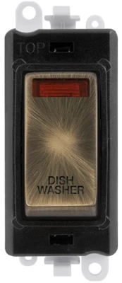 Gridpro dishwasher laser etched legend black frame 20AX antique brass double pole switch with neon module. · · · Dimensions 24.5mm (W) x 50mm (H) x 22.5mm (D) · · Aperture Dimensions 20mm (W) x 35mm (H) · · Module Frame Finish Black · · Switch Finish Antique Brass · · Laser Etched Legend Dishwasher · · Body & Insert: Nylon · · Maximum Voltage 250V 50Hz · · Load Rating 20AX (Suitable For Inductive Loads) · · Terminal Size 5mm · · Termination Type Screw
