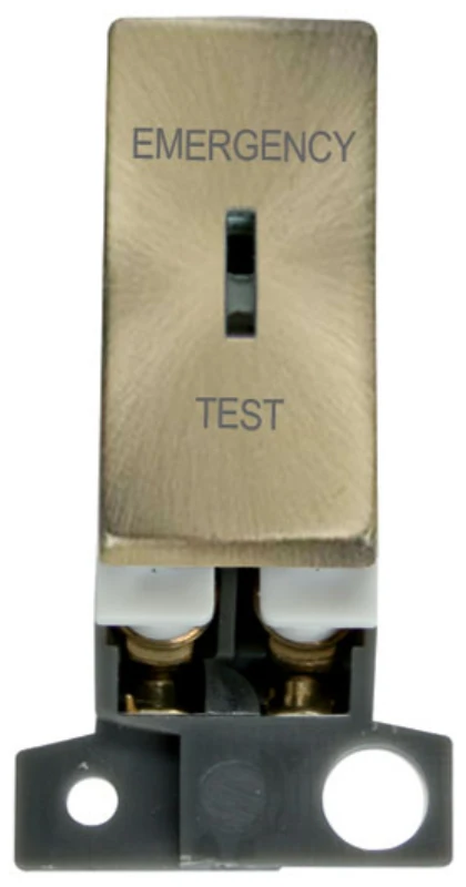 Minigrid emergency test antique brass 10AX double pole keyswitch module. · · · Dimensions 25mm (W) x 52.5mm (H) x 20mm (D) · · Aperture Dimensions 16mm (W) x 31.5mm (H) · · Finish Antique Brass · · Cover & Rocker Switch: Urea · · Rear Housing: Nylon · · Maximum Voltage 250V 50Hz · · Load Rating 10AX (Suitable For Inductive Loads) · · Terminal Size 3.5mm · · Terminal Torque 0.4Nm · · Terminal Capacity 4 x 1.5mm