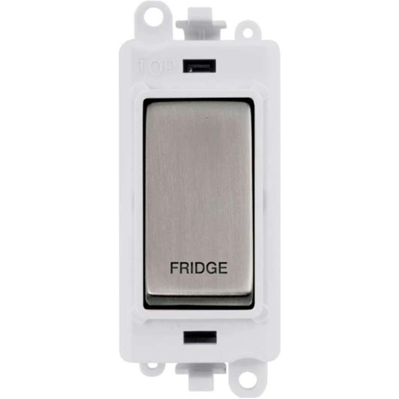 Gridpro fridge laser etched legend polar white frame 20AX stainless steel double pole switch module. · · · Dimensions 24.5mm (W) x 50mm (H) x 22.5mm (D) · · Aperture Dimensions 20mm (W) x 35mm (H) · · Module Frame Finish Polar White · · Switch Finish Stainless Steel · · Laser Etched Legend Fridge · · Body & Insert: Nylon · · Maximum Voltage 250V 50Hz · · Load Rating 20AX (Suitable For Inductive Loads) · · Terminal Size 5mm · · Termination Type Screw
