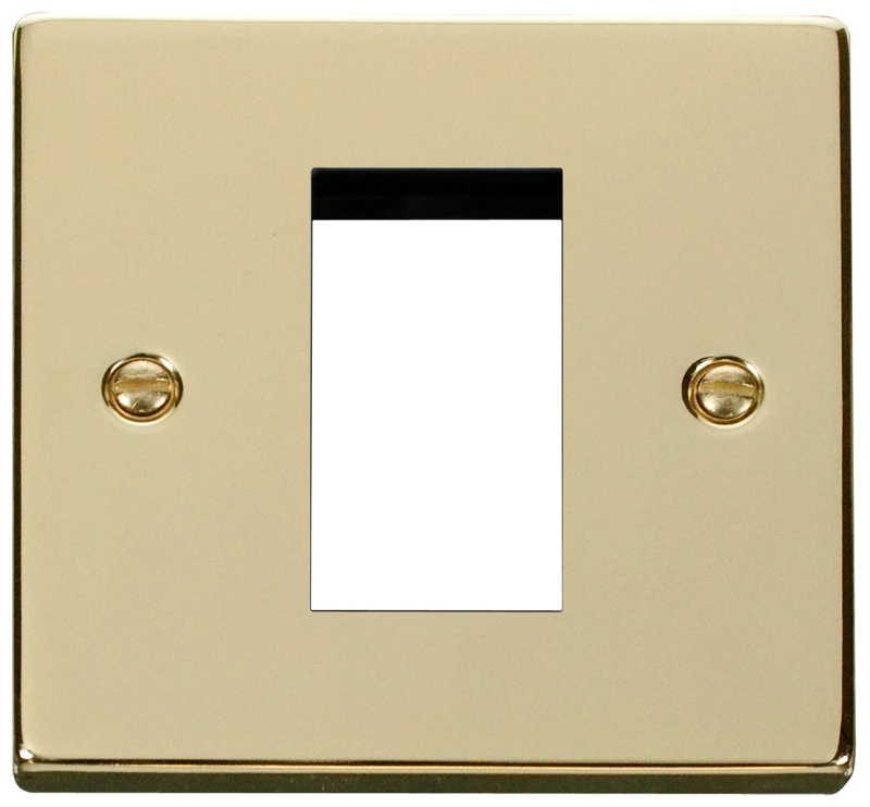 Scolmore New Media Unfurnished Plate with Polished Brass finish. Unfurnished mounting plates can be ordered separately and furnished with whatever selection of switch modules may be required. · · · 1 gang · · 1 apertures · · Unfurnished · · Back Box Depth Dependent On Modules Fitted · · Standards BS 5733: 2010 · · Gasket Colour Supplied With Both Black & White Gasket · · Warranty 10 Years