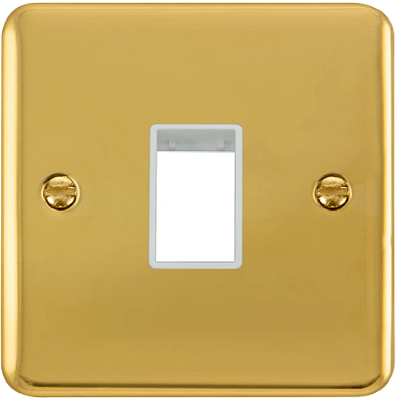 Deco plus rounded profile polished brass 1 gang minigrid unfurnished plate – 1 aperture. · · · Dimensions 88mm (W) x 88mm (H) x 8mm (D) · · Dimensions With Gasket 91mm (W) x 91mm (H) x 9mm (D) · · Plate Design & Finish Rounded Profile Polished Brass · · Insert & Gasket Colour White · · Plate Fixing Centres 60.3mm · · Ingress Protection IP20 · · Operational Temperature -5°C to +40°C · · Warranty 10 Years