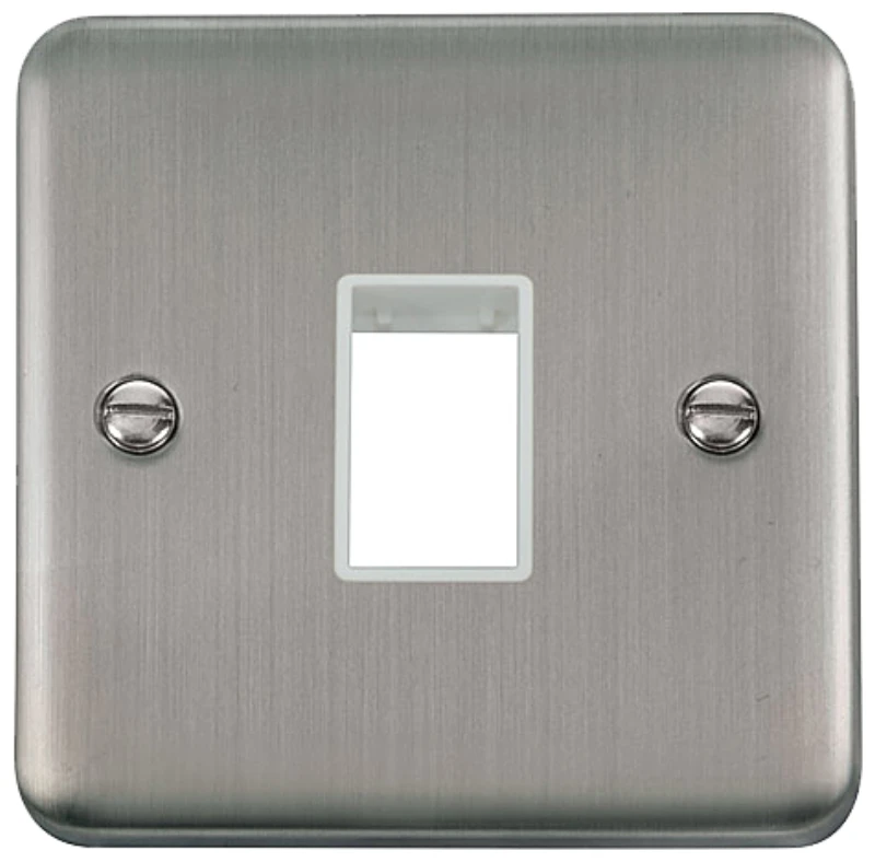 Deco plus rounded profile stainless steel white insert 1 gang minigrid unfurnished plate – 1 aperture. · · · Dimensions 88mm (W) x 88mm (H) x 8mm (D) · · Plate Design & Finish Rounded Profile Stainless Steel · · Insert & Gasket Colour White · · Front Plate: Stainless Steel · · Insert: Urea · · Plate Fixing Centres 60.3mm · · Ingress Protection IP20 · · Operational Temperature -5°C to +40°C · · Warranty 10 Years