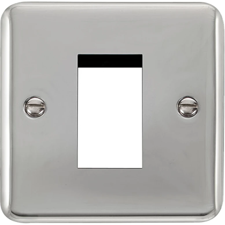 Deco plus rounded profile polished chrome 1 gang new media unfurnished plate – 1 aperture · · · Dimensions 88mm (W) x 88mm (H) x 8mm (D) · · Gasket Colour Supplied With Both Black & White Gasket · · Front Plate: Stainless Steel · · Plate Fixing Centres 60.3mm · · Ingress Protection IP20 · · Operational Temperature -5°C to +40°C · · Warranty 10 Years