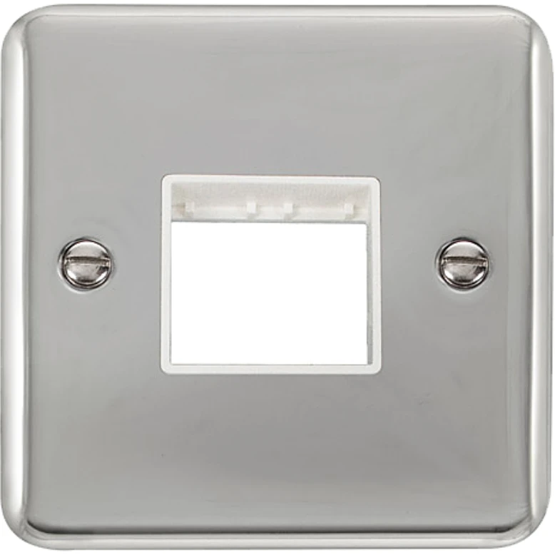 Deco plus rounded profile polished chrome white insert 1 gang minigrid unfurnished plate – 2 apertures. · · · Dimensions 88mm (W) x 88mm (H) x 8mm (D) · · Plate Design & Finish Rounded Profile Polished Chrome · · Insert & Gasket Colour White · · Front Plate: Stainless Steel · · Plate Fixing Centres 60.3mm · · Ingress Protection IP20 · · Operational Temperature -5°C to +40°C · · Warranty 10 Years