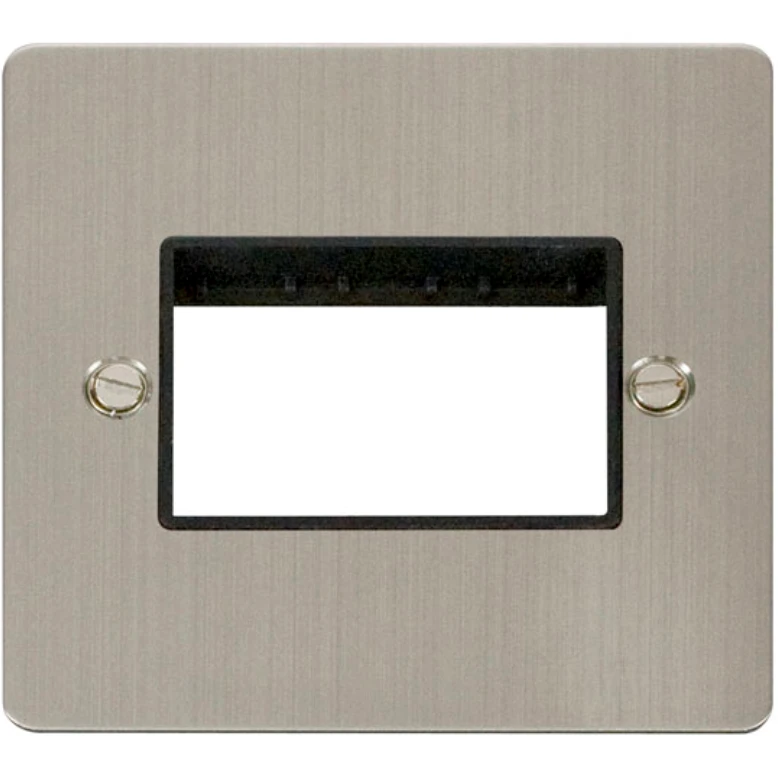 Scolmore MiniGrid Unfurnished Plate with stainless steel finish. Unfurnished mounting plates can be ordered separately and furnished with whatever selection of switch modules may be required. · · · 1 gangs · · 3 apertures · · Back Box Depth Dependent On Modules Fitted · · Standards BS 5733: 2010 · · Warranty 10 Years