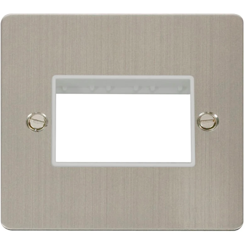 Define flat plate stainless steel white insert 1 gang minigrid unfurnished plate – 3 apertures. · · · Dimensions 86mm (W) x 86mm (H) x 1.3mm (D) · · Plate Design & Finish Flat Plate Stainless Steel · · Insert Colour White · · Front Plate: Stainless Steel · · Plate Fixing Centres 60.3mm · · Ingress Protection IP20 · · Operational Temperature -5°C to +40°C · · Warranty 10 Years