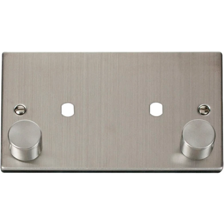 Scolmore Click dimmer mounting unfurnished plates. The smooth modern lines of the plates will fit easily into traditional and contemporary designs alike. The plates produce a comprehensive yet flexible and user friendly system which enables the installer to easily create topical media and power cabling solutions using any combination. Units are tested and approved to BS1363 · · · 2 gang · · 2 Apertures · · Maximum Wattage 1630w · · Plate Fixing Centres 120.6mm · · Back Box Depth Dependent On Modules Fitted · · Operational Temperature -5C to +40C · · IP20 · · Gasket Colour Supplied With Both Black & White Gasket