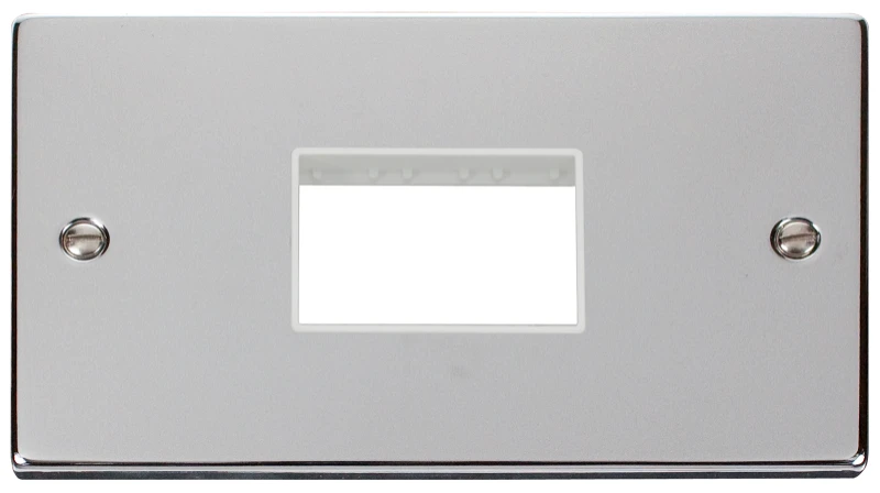 Scolmore MiniGrid Unfurnished Plate with polished chrome finish. Unfurnished mounting plates can be ordered separately and furnished with whatever selection of switch modules may be required. · · · 2 gangs · · 3 apertures · · Plate Fixing Centres 120.6mm · · Back Box Depth Dependent On Modules Fitted · · Operational Temperature -5C to +40C · · Insert & Gasket Colour White