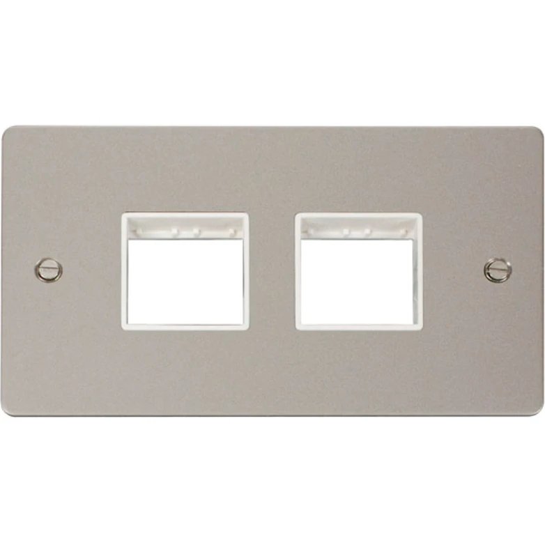 Define flat plate pearl nickel white insert 2 gang minigrid unfurnished plate – 2 x 2 apertures. · · · Dimensions 146mm (W) x 88mm (H) x 1.3mm (D) · · Plate Design & Finish Flat Plate Pearl Nickel · · Insert Colour White · · Front Plate: Stainless Steel · · Plate Fixing Centres 120.6mm · · Ingress Protection IP20 · · Operational Temperature -5°C to +40°C · · Warranty 10 Years