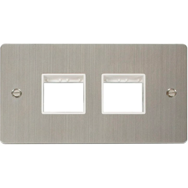 Scolmore MiniGrid Unfurnished Plate with stainless steel finish. Unfurnished mounting plates can be ordered separately and furnished with whatever selection of switch modules may be required. · · · 2 gangs · · 2 x 2 apertures · · Back Box Depth Dependent On Modules Fitted · · Standards BS 5733: 2010 · · Warranty 10 Years