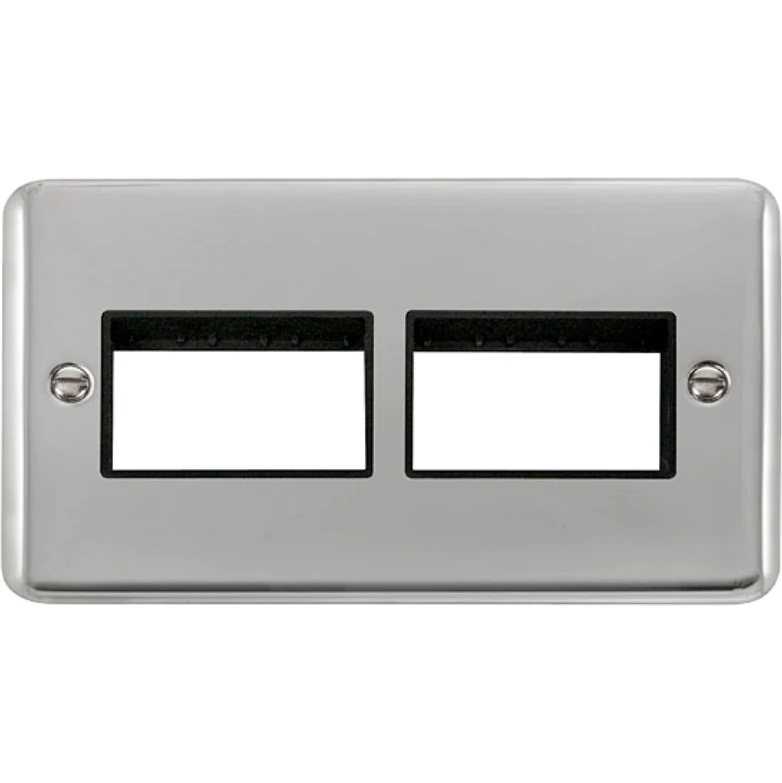Deco plus rounded profile polished chrome white insert 2 gang minigrid unfurnished plate – 2 x 3 apertures. · · · Dimensions 146mm (W) x 88mm (H) x 8mm (D) · · Plate Design & Finish Rounded Profile Polished Chrome · · Insert & Gasket Colour White · · Front Plate: Stainless Steel · · Plate Fixing Centres 120.6mm · · Ingress Protection IP20 · · Operational Temperature -5°C to +40°C · · Warranty 10 Years
