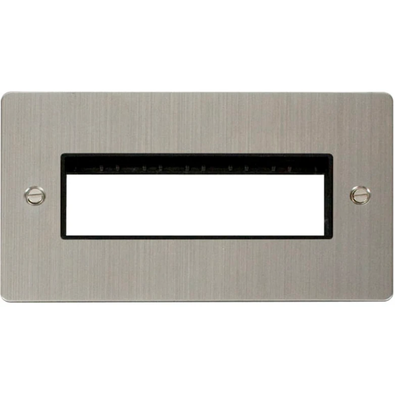 Scolmore MiniGrid Unfurnished Plate with stainless steel finish. Unfurnished mounting plates can be ordered separately and furnished with whatever selection of switch modules may be required. · · · 2 gangs · · 6 apertures · · Back Box Depth Dependent On Modules Fitted · · Standards BS 5733: 2010 · · Warranty 10 Years