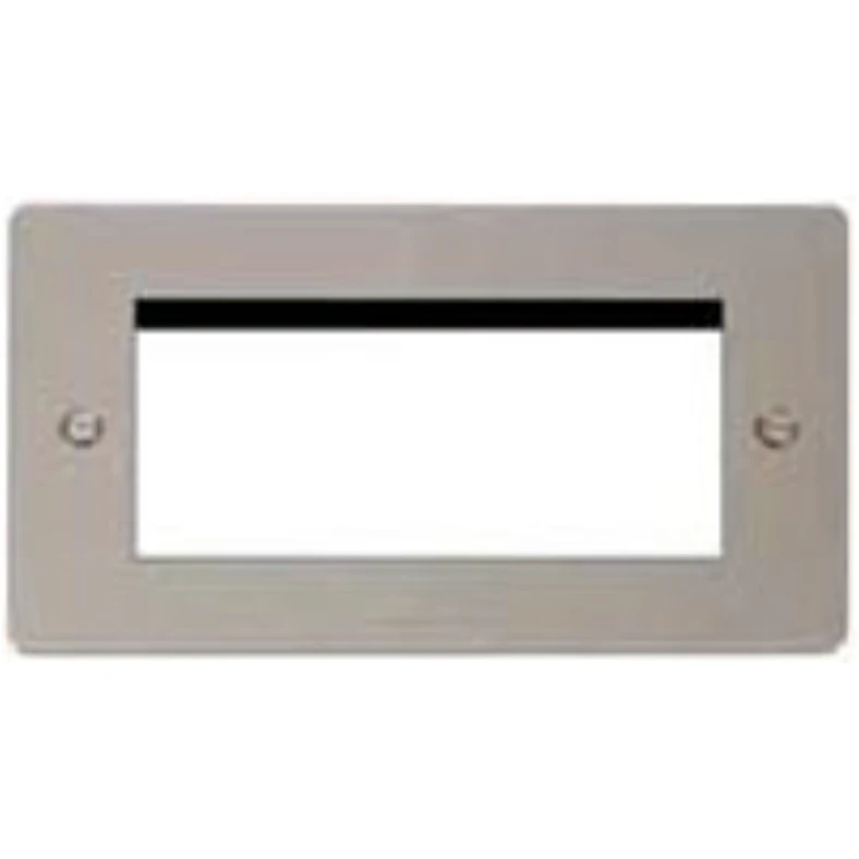 FPPN312 Pearl Nickel frontplate, 2 gang quad aperture · · · Pearl nickel finish · · Front Plate: Stainless Steel Insert: Nylon Earth Strap: Mild Steel · · Plate Fixing Centres 120.6mm · · Back Box Depth Dependent On Modules Fitted · · IP20 protection rating · · 10 year warranty · · BS 5733: 2010