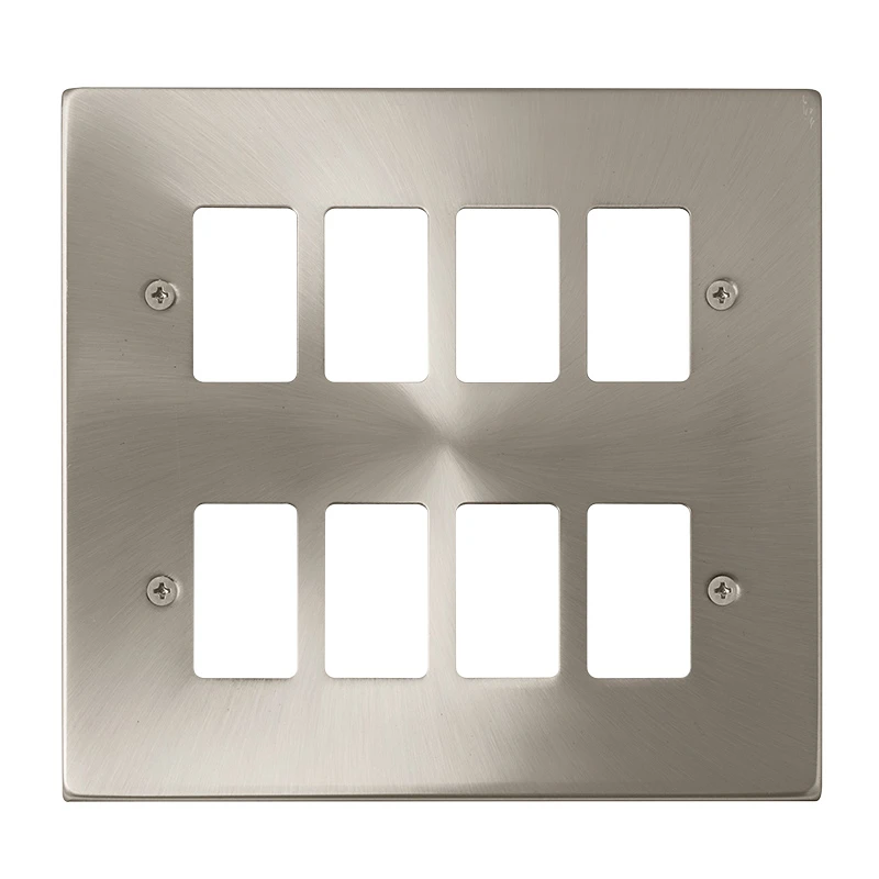 Scolmore Deco GridPro Front Plate with satin chrome finish. This product range is available in 8 finishes, a brand that is synonymous with high quality, long life, high specification and unprecedented value for money. · · · 8 gangs · · Satin chrome finish