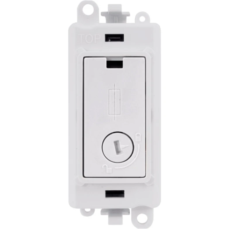 Scolmore International GM2047-LPW GridPro Fused Module Lockable – White Insert 13A · · · Dimensions 24.5mm (W) x 50mm (H) x 25mm (D) · · Aperture Dimensions 20mm (W) x 35mm (H) · · Module Frame Finish Polar White · · Module Finish Polar White · · Materials Body & Insert: Nylon · · Maximum Voltage 250V 50Hz