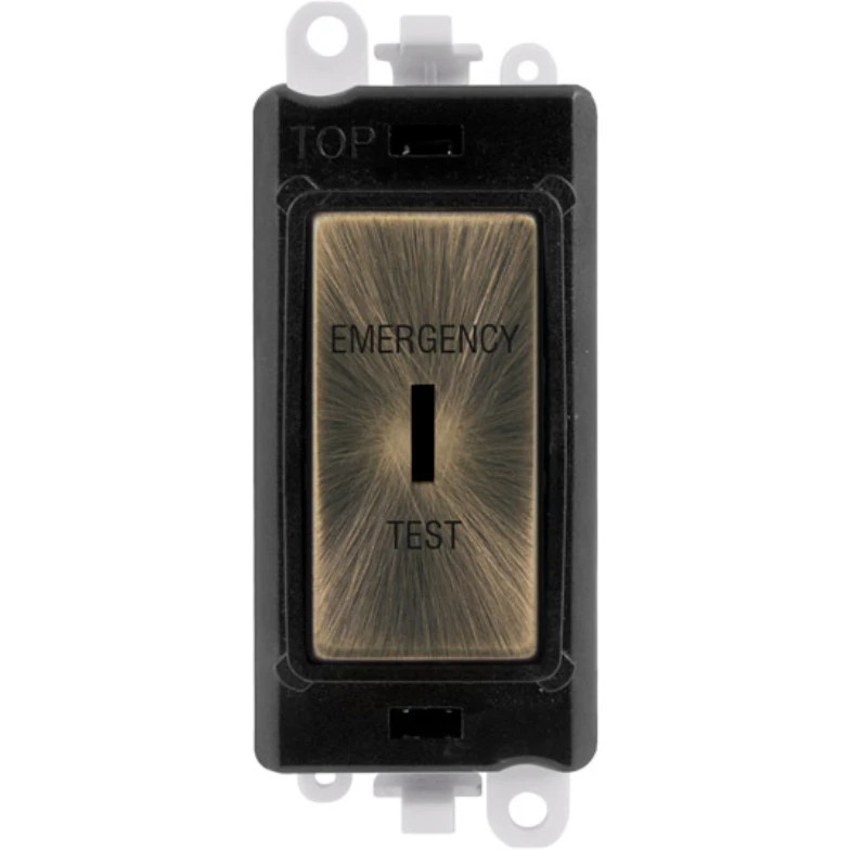 GridPro Antique Brass 20AX 2 Pole Emergency Test Keyswitch Module – Black Insert · · · Printed with “Emergency Test” · · Back box depth: 25-47mm · · Terminal size: 5mm diameter · · Module Width: 24.5mm – Module Height: 50mm · · Aperture Width: 20mm – Aperture Height: 35mm · · Finish: Black with Antique Brass aperture · · Manufactured from urea, stainless steel and nylon · · Supplied with key · · 10 Year Warranty