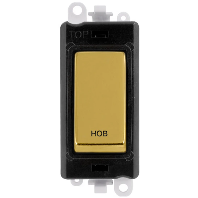 Gridpro hob laser etched legend 20AX polished brass double pole switch module. · · · Dimensions 24.5mm (W) x 50mm (H) x 22.5mm (D) · · Aperture Dimensions 20mm (W) x 35mm (H) · · Module Frame Finish Black · · Switch Finish Polished Brass · · Laser Etched Legend Hob · · Body & Insert: Nylon · · Maximum Voltage 250V 50Hz · · Load Rating 20AX (Suitable For Inductive Loads) · · Terminal Size 5mm · · Termination Type Screw