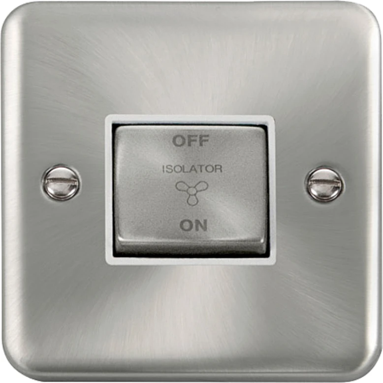 Deco plus rounded profile satin chrome white insert 10A ingot 3 pole fan isolation plate switch. · · · Dimensions 88mm (W) x 88mm (H) x 8mm (D) · · Plate Design & Finish Rounded Profile Satin Chrome · · Insert & Gasket Colour White · · Front Plate: Stainless Steel · · Maximum Voltage 250V · · Load Rating 10A · · Plate Fixing Centres 60.3mm · · Terminal Size 3.5mm · · Terminal Torque 0.4Nm · · Terminal Capacity 4 x 1.5mm