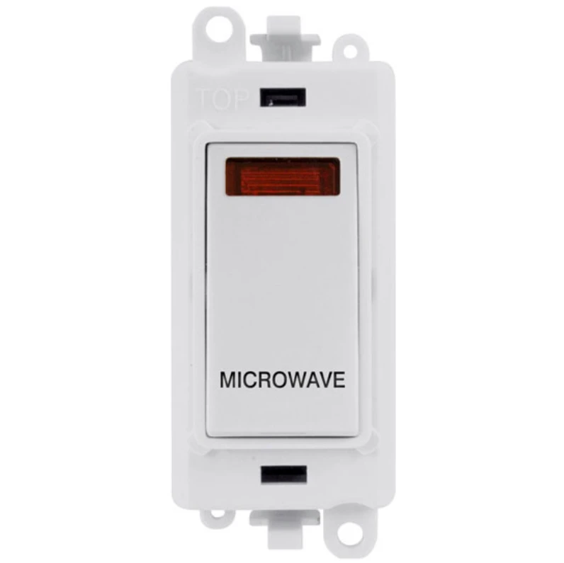 Gridpro microwave laser etched legend polar white frame 20AX polar white double pole switch with neon module. · · · Dimensions 24.5mm (W) x 50mm (H) x 22.5mm (D) · · Aperture Dimensions 20mm (W) x 35mm (H) · · Module Frame Finish Polar White · · Switch Finish Polar White · · Laser Etched Legend Microwave · · Body & Insert: Nylon · · Maximum Voltage 250V 50Hz · · Load Rating 20AX (Suitable For Inductive Loads) · · Terminal Size 5mm · · Termination Type Screw