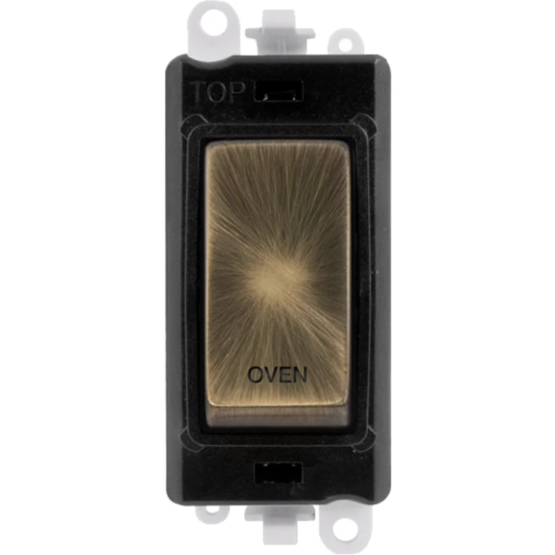Gridpro oven laser etched legend black frame 20AX antique brass double pole switch module. · · · Dimensions 24.5mm (W) x 50mm (H) x 22.5mm (D) · · Aperture Dimensions 20mm (W) x 35mm (H) · · Module Frame Finish Black · · Switch Finish Antique Brass · · Laser Etched Legend Oven · · Body & Insert: Nylon · · Maximum Voltage 250V 50Hz · · Load Rating 20AX (Suitable For Inductive Loads) · · Terminal Size 5mm · · Termination Type Screw