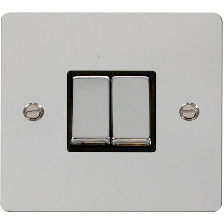 Define flat plate polished chrome black insert 10AX ingot 2 gang 2 way plate switch. · · · Dimensions 86mm (W) x 86mm (H) x 1.3mm (D) · · Plate Design & Finish Flat Plate Polished Chrome · · Insert Colour Black · · Front Plate: Stainless Steel · · Maximum Voltage 250V · · Load Rating 10AX (Suitable for Inductive Loads) · · Plate Fixing Centres 60.3mm · · Terminal Size 3.5mm · · Terminal Torque 0.5Nm · · Terminal Capacity 4 x 1.5mm