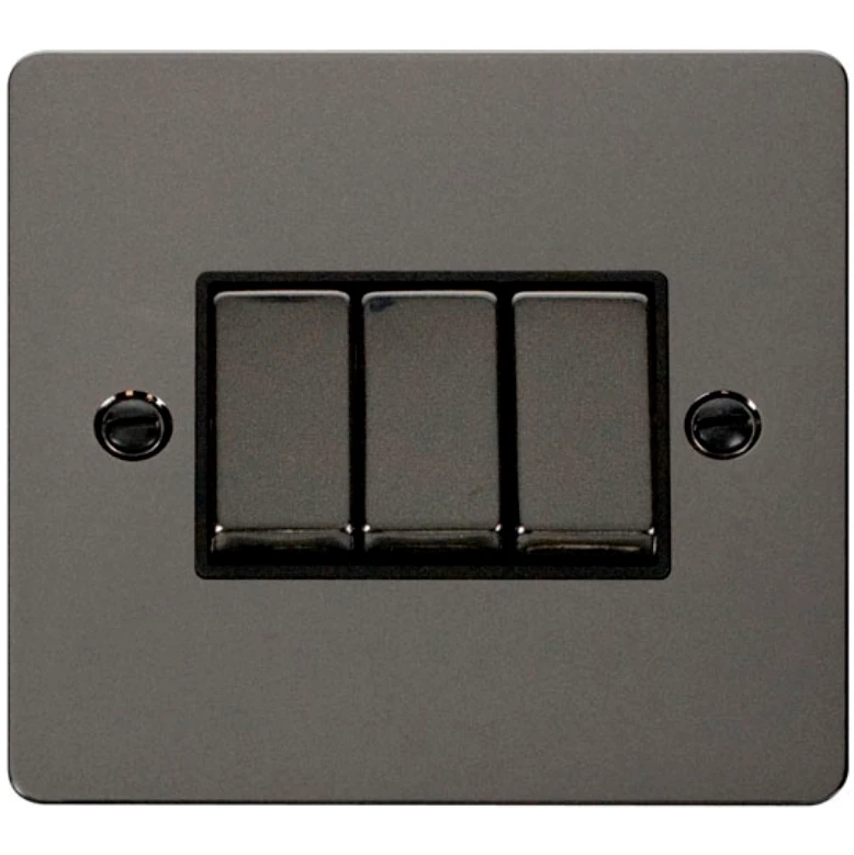 Define flat plate black nickel black insert10AX ingot 3 gang 2 way plate switch. · · · Dimensions 86mm (W) x 86mm (H) x 1.3mm (D) · · Plate Design & Finish Define Flat Plate Black Nickel · · Insert Colour Black · · Front Plate: Stainless Steel · · Insert: Urea · · Maximum Voltage 250V · · Load Rating 10AX (Suitable for Inductive Loads) · · Plate Fixing Centres 60.3mm · · Terminal Size 3.5mm · · Terminal Torque 0.5Nm
