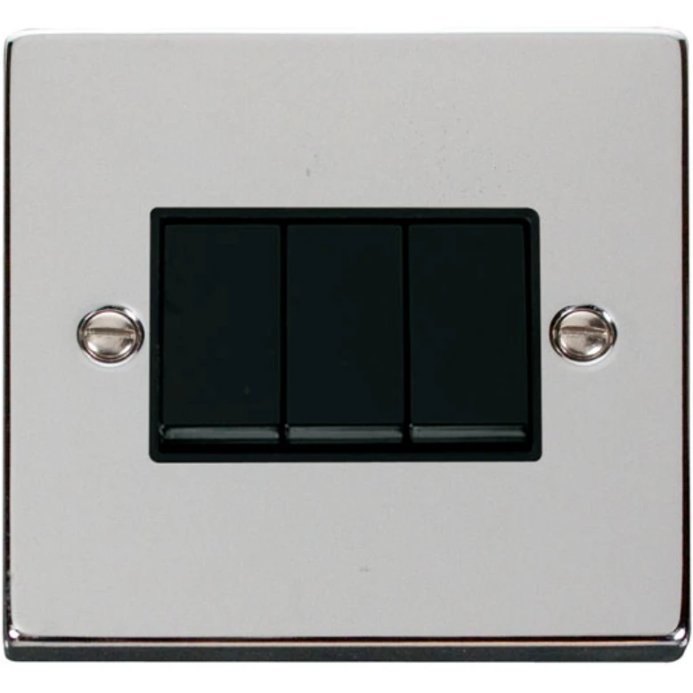 Click Scolmore Plate Switch 3 Gang 2 Way 10A Polished Chrome Black Insert Victorian