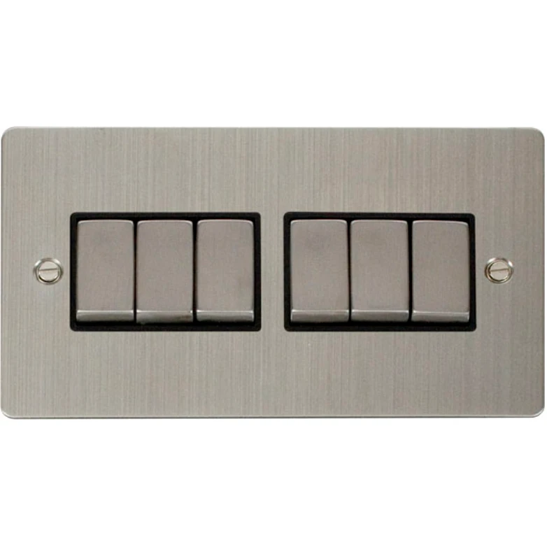 Click Scolmore Plate Switch 6 Gang 2 Way 10A Stainless Steel Black Insert