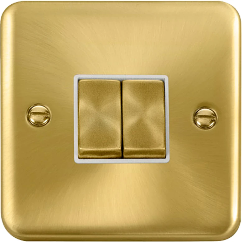 Deco plus rounded profile satin brass white insert 10AX ingot 2 gang 2 way plate switch. · · · Dimensions 88mm (W) x 88mm (H) x 8mm (D) · · Plate Design & Finish Rounded Profile Satin Brass · · Insert & Gasket Colour White · · Front Plate: Stainless Steel · · Maximum Voltage 250V · · Load Rating 10AX (Suitable for Inductive Loads) · · Plate Fixing Centres 60.3mm · · Terminal Size 3.5mm · · Terminal Torque 0.5Nm · · Terminal Capacity 4 x 1.5mm