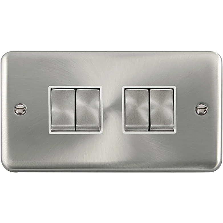 Deco plus rounded profile satin chrome white insert 10AX ingot 4 gang 2 way plate switch. · · · Dimensions 146mm (W) x 88mm (H) x 8mm (D) · · Plate Design & Finish Deco Plus Rounded Profile Satin Chrome · · Insert & Gasket Colour White · · Front Plate: Stainless Steel · · Maximum Voltage 250V · · Load Rating 10AX (Suitable for Inductive Loads) · · Plate Fixing Centres 120.6mm · · Terminal Size 3.5mm · · Terminal Torque 0.5Nm · · Terminal Capacity 4 x 1.5mm
