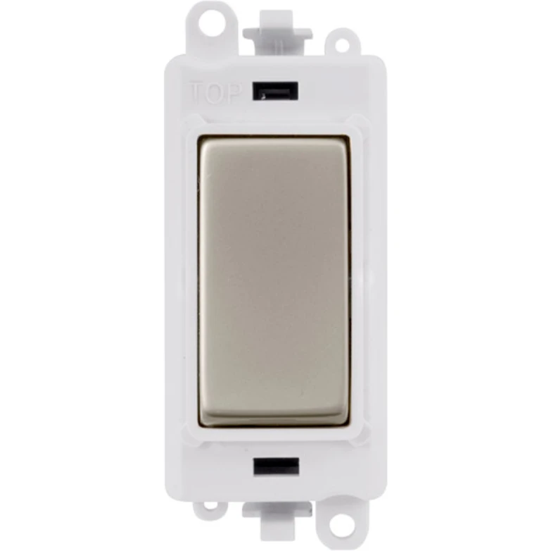 Gridpro polar white frame 20AX pearl nickel 3 position centre ‘Off’ retractive switch module. · · · Dimensions 24.5mm (W) x 50mm (H) x 22.5mm (D) · · Aperture Dimensions 20mm (W) x 35mm (H) · · Module Frame Finish Polar White · · Switch Finish Pearl Nickel · · Switch Finish Polished Chrome · · Maximum Voltage 250V 50Hz · · Load Rating 20AX (Suitable For Inductive Loads) · · Terminal Size 5mm · · Termination Type Screw · · Terminal Torque 1.2Nm