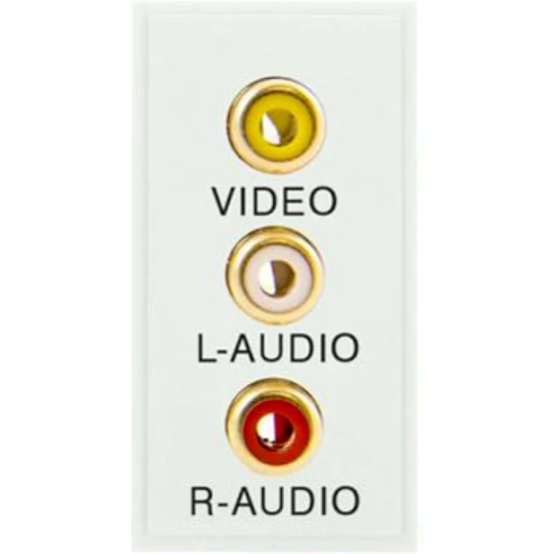 New Media polar white triple RCA/phono module. · · · Dimensions (mm) 25 (W) x 50 (H) x 18.3 (D) · · Overall Dimensions (mm) 25 (W) x 50 (H) x 27 (D) · · Finish Polar White · · Cover: Polycarbonate · · PCB: Electronic Components · · Anti Microbial Certified No · · Termination Type Screw · · Minimum Back Box Depth (mm) 25 (35 Flat Plate) · · Ingress Protection IP20 · · Operational Temperature (°C) -5 to +40