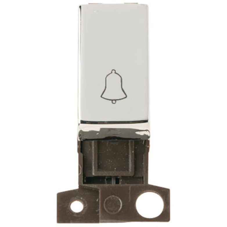 Minigrid polished chrome 10AX ingot 1 way retractive bell switch module. · · · Dimensions 25mm (W) x 53mm (H) x 20mm (D) · · Aperture Dimensions 16mm (W) x 31.5mm (H) · · Finish Polished Chrome · · Cover & Rocker Switch: Urea · · Rear Housing: Nylon · · Maximum Voltage 250V 50Hz · · Load Rating 10AX (Suitable For Inductive Loads) · · Terminal Size 3.5mm · · Terminal Torque 0.4Nm · · Terminal Capacity 4 x 1.5mm
