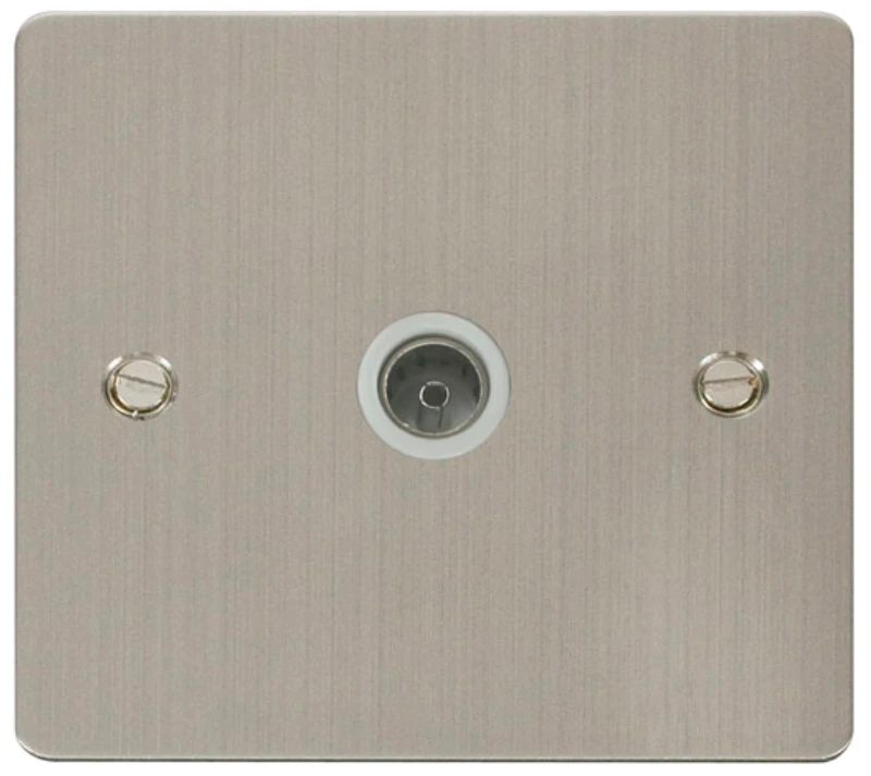 Scolmore Define Series Single Non-Isolated Coaxial Outlet comes with stainless steel finish. The smooth modern lines of the Define accessory plate will fit easily into traditional and contemporary designs alike. The plate finish offers a solution for almost every possible design need and will enhance the decor of any area whether in a kitchen, bedroom, lounge or study etc. · · · Single Gang · · Shielded: No · · Non-isolated (Direct connection to aerial where 2 way signal is required) · · Flat Plate Stainless Steel · · Insert Colour White · · IP20 · · Back Box Depth 16mm Minimum · · 10 year warranty · · BS 5733:1995 (where applicable)