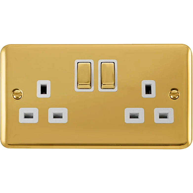 Deco plus rounded profile polished brass white insert 13A ingot 2 gang double pole switched socket outlet. · · · Dimensions 146mm (W) x 88mm (H) x 8mm (D) · · Plate Design & Finish Rounded Profile Polished Brass · · Insert & Gasket Colour White · · Maximum Voltage 250V · · Load Rating 13A · · Plate Fixing Centres 120.6mm · · Terminal Size 5mm · · Terminal Torque 2.5Nm · · Double Pole Yes · · Twin Earth Terminals Yes