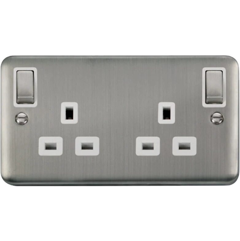 Deco plus white insert rounded profile stainless steel 13A ingot 2 gang double pole switched socket outlet with outboard rockers. · · · Plate Dimensions (mm) 146 (W) x 88 (H) x 8 (D) · · Plate Fixing Centres – Horizontal (mm) 120.6 · · Style Rounded Profile · · Finish Stainless Steel · · Insert Colour White · · Gasket Colour White · · Anti Microbial Certified No · · Rated Voltage (V) (Ue) 250 · · Resistive Load Rating (A) 13 · · Termination Type Screw