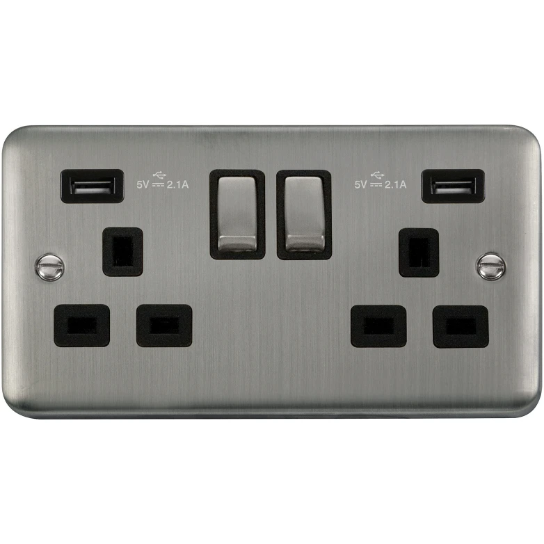 Deco plus rounded profile black insert stainless steel 13A ingot 2 gang switched socket outlet with twin USB (total 4.2A) outlets. · · · Plate Dimensions (mm) 146 (W) x 88 (H) x 8 (D) · · Plate Fixing Centres – Horizontal (mm) 120.6 · · Style Rounded Profile · · Finish Stainless Steel · · Insert Colour Black · · Gasket Colour Black · · Anti Microbial Certified No · · Rated Voltage (V) (Ue) 250 · · Resistive Load Rating (A) 13 · · USB Output Type USB Type “A”