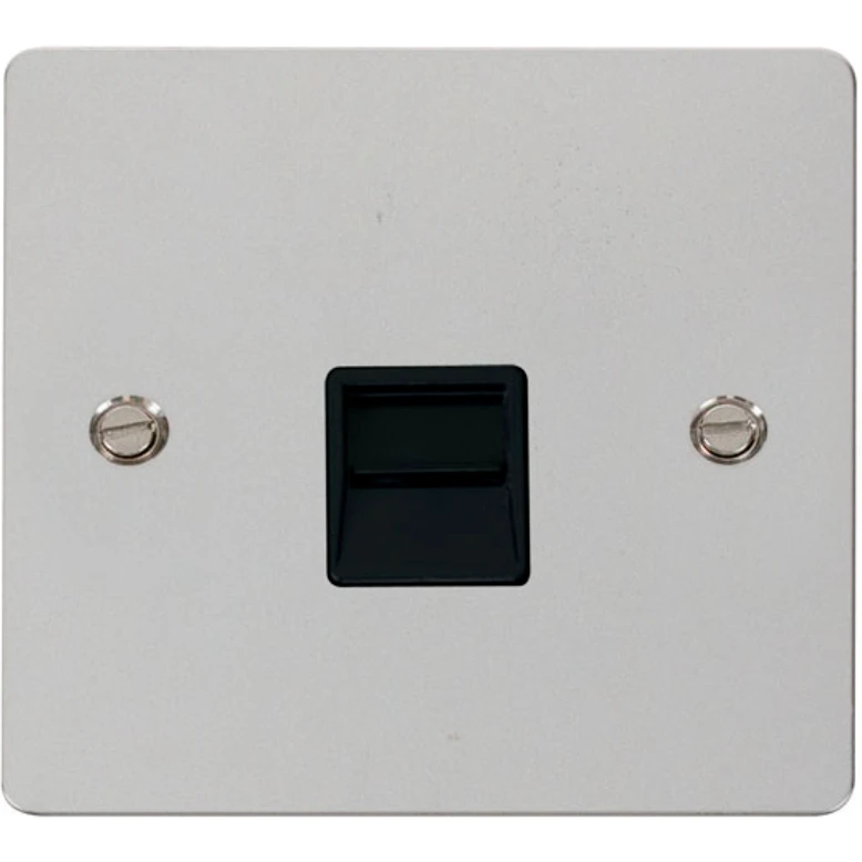 Scolmore Define Series Single Telephone Outlet (Secondary) comes with polished chrome finish. The smooth modern lines of the Define accessory plate will fit easily into traditional and contemporary designs alike. The plate finish offers a solution for almost every possible design need and will enhance the decor of any area whether in a kitchen, bedroom, lounge or study etc. · · · Single Gang · · Shielded: No · · Terminal Size IDC · · Flat Plate Polished Chrome · · Insert Colour Black · · IP20 · · Back Box Depth 25mm Minimum · · 10 year warranty