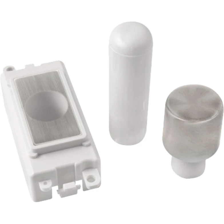 Gridpro polar white module frame stainless steel 1 module dimmer mounting kit. · · · Dimensions 24.5mm (W) x 50mm (H) · · Aperture Dimensions 20mm (W) x 35mm (H) · · Module Frame Finish Polar White · · Module & Control Button Finish Stainless Steel · · Body & Insert: Nylon · · Plate Fixing Centres 60.3mm · · Back Box Depth 47mm · · Operational Temperature -5°C to +40°C · · Warranty 10 Years