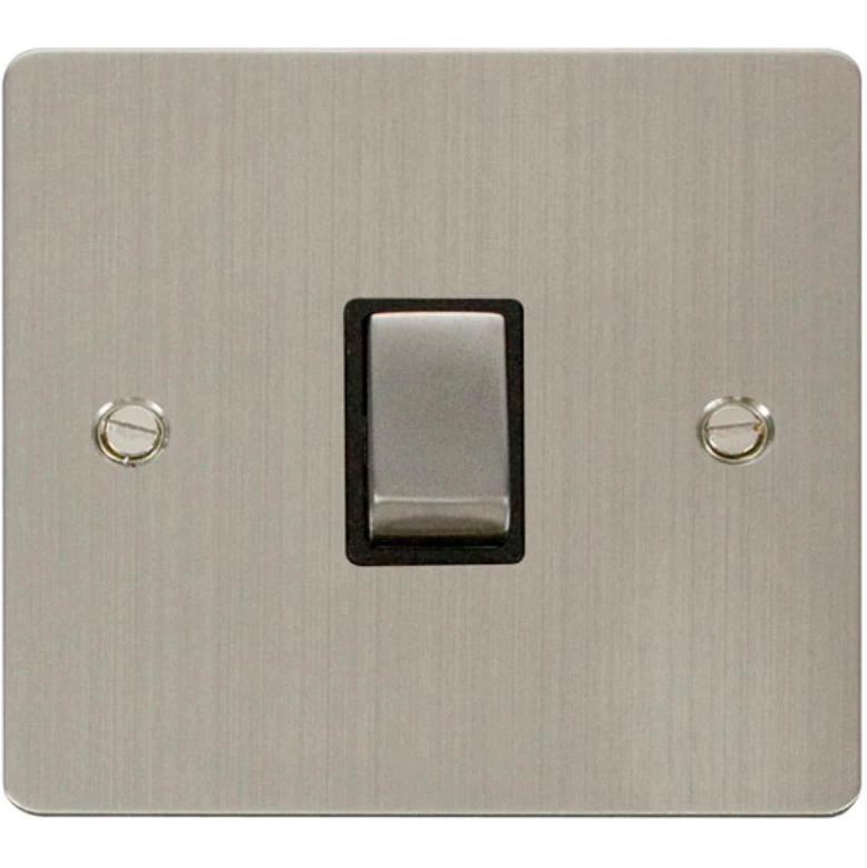 Define flat plate stainless steel black insert 20A ingot double pole plate switch. · · · Dimensions 86mm (W) x 86mm (H) x 1.3mm (D) · · Plate Design & Finish Flat Plate Stainless Steel · · Insert Colour Black · · Front Plate: Stainless Steel · · Maximum Voltage 250V · · Load Rating 20A · · Plate Fixing Centres 60.3mm · · Terminal Size 5mm · · Terminal Torque 1.8Nm · · Terminal Capacity 4 x 2.5mm