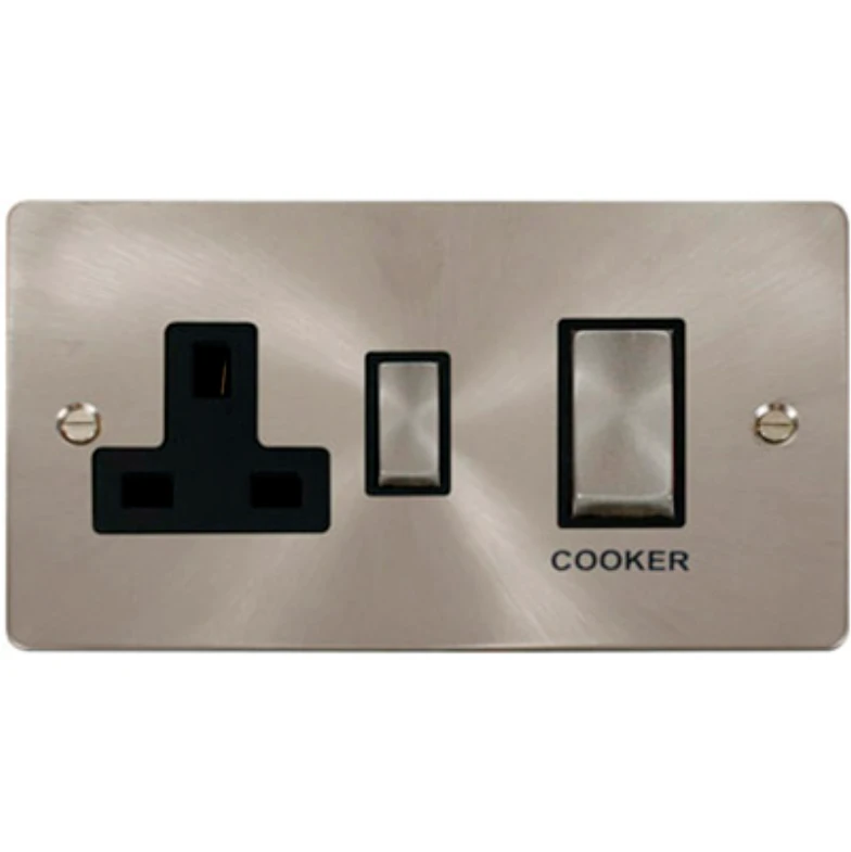 Define flat plate brushed stainless black insert 45A ingot 2 gang double pole switch with 13A double pole switched socket outlet. · · · Dimensions 146mm (W) x 88mm (H) x 1.3mm (D) · · Plate Design & Finish Flat Plate Brushed Stainless · · Insert Colour Black · · Front Plate: Stainless Steel · · Maximum Voltage 250V · · Load Rating 45A · · Plate Fixing Centres 120.6mm (Vertical Fixing) · · Terminal Size 6mm · · Terminal Torque 2.5Nm · · Terminal Capacity 1 x 16mm