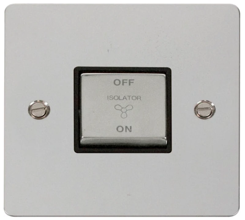 Define black insert flat plate polished chrome black insert 10A ingot 3 pole fan isolation plate switch. · · · Dimensions 86mm (W) x 86mm (H) x 1.3mm (D) · · Plate Design & Finish Flat Plate Polished Chrome · · Insert Colour Black · · Front Plate: Stainless Steel · · Maximum Voltage 250V · · Load Rating 10A · · Plate Fixing Centres 60.3mm · · Terminal Size 3.5mm · · Terminal Torque 0.4Nm · · Terminal Capacity 4 x 1.5mm
