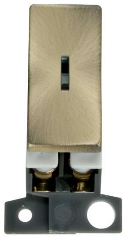 Scolmore MiniGrid Keyswitch Module Antique Brass finish. This MiniGrid module is easily and quickly exchanged or mounted onto unfurnished plates by means of a simple single screw fixing. · · · Antique Brass finish · · 10AX (Suitable For Inductive Loads) · · BS EN 60669-1