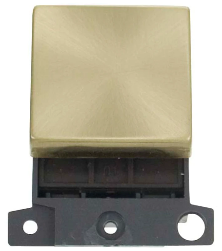 Scolmore MiniGrid Switch Module with Click Satin Brass finish. This MiniGrid module is easily and quickly exchanged or mounted onto unfurnished plates by means of a simple single screw fixing. · · · Satin Brass finish · · 20A DP · · BS EN 60669