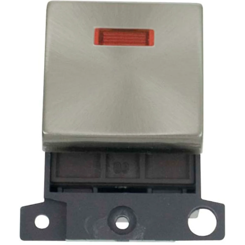 Scolmore MiniGrid 20A Ingot DP Switch Module with Brushed Stainless finish. This MiniGrid module is easily and quickly exchanged or mounted onto unfurnished plates by means of a simple single screw fixing. · · · Load Rating 20A · · 2 Module · · Terminal Torque 1.2Nm · · Terminal Capacity 4 x 1.5mm2 or 2 x 2.5mm2 · · Back Box Depth Dependent On Plate Used · · Standards BS EN 60669-1:1999 +A1:2002 +A2:2008 · · Warranty 10 Years