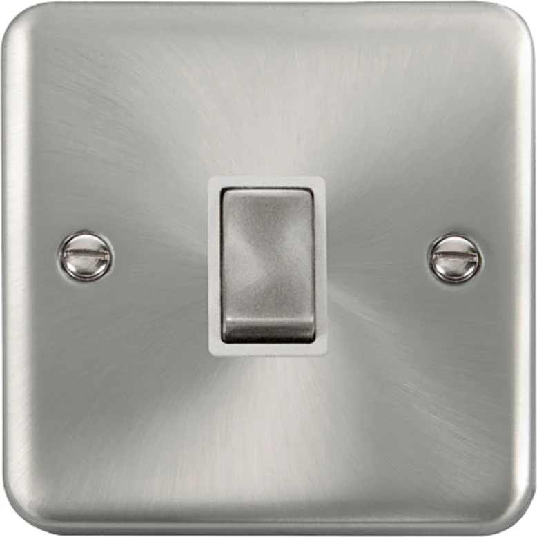 Deco plus rounded profile satin chrome white insert 20A ingot double pole plate switch. · · · Dimensions 88mm (W) x 88mm (H) x 8mm (D) · · Plate Design & Finish Rounded Profile Satin Chrome · · Insert & Gasket Colour White · · Front Plate: Stainless Steel · · Maximum Voltage 250V · · Load Rating 20A · · Plate Fixing Centres 60.3mm · · Terminal Size 5mm · · Terminal Torque 1.8Nm · · Terminal Capacity 4 x 2.5mm