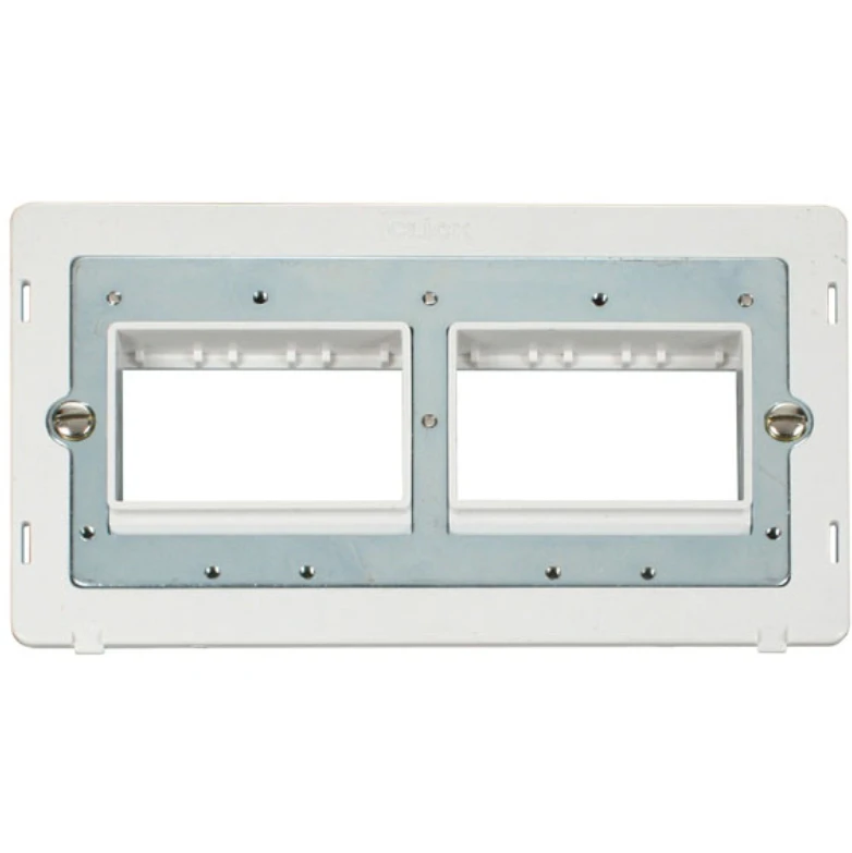 The Scolmore Definity Gang MiniGrid unfurnished plate insert – 2×3 apertures. The smooth, clean lines of Click Definity provide the ultimate finishing touch to a feature packed range of decorative domestic wiring accessories. Each Click Definity wiring accessories comprises an insert and a decorative cover plate. Plates are available in 5 different finishes as detailed in this catalogue and as illustrated below. UK Design Registration 3015621. Simply select the required insert and choice of cover plate finish. Cover Plate Finishes Available BS (Brushed Stainless), CH (Polished Chrome), SS (Stainless Steel), BK (Matt Black), PW (Polar White) & RD (Red). Interchangeable with modules in the MiniGrid Range · · · 2 gang · · 2×3 aperture · · Plate Fixing Centres 120.6mm · · Back Box Depth Dependent On Modules Fitted · · Operational Temperature -5C to +40C · · IP20