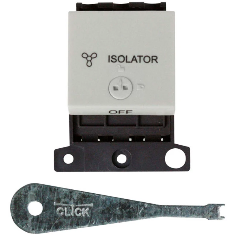 Scolmore International MD220WH Minigrid Switch TP Lockable Fan Module 10A Click White · · · 10A, 3 Pole Fan Isolation Switch (Lockable) · · Finish: Click White · · BSEN60669 standard · · Minimum Back Box Depth: 25mm (35Flat Plate)